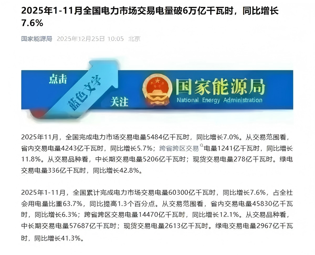 国家能源局:1至11月全国电力市场交易电量破6万亿千瓦时 同比增长7.6%