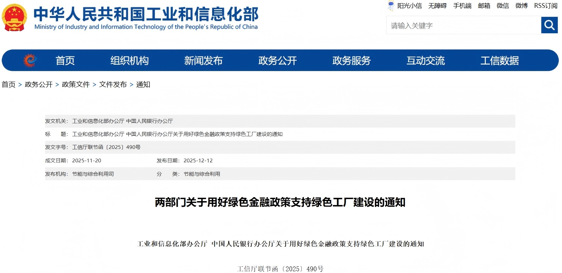 工信部、中国人民银行发布《关于用好绿色金融政策支持绿色工厂建设的通知》