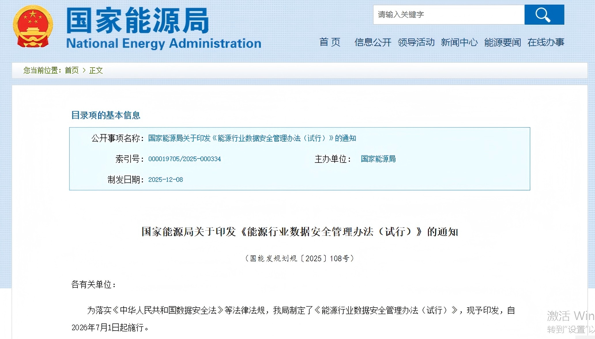国家能源局印发《能源行业数据安全管理办法(试行)》