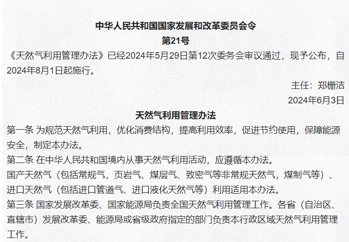 国家发改委印发《天然气利用管理办法》,自8月1日起施行