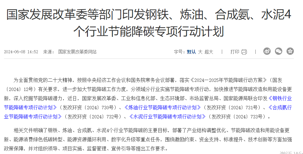 国家发展改革委等部门印发钢铁、炼油、合成氨、水泥4个行业节能降碳专项行动计划